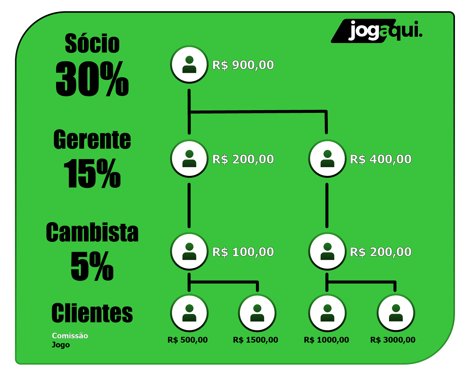 A comissão recebida pelo GERENTE é dividida com seus CAMBISTAS, onde desta vez o percentual a ser distribuído é definido pelo GERENTE e não mais pela Jogaqui.